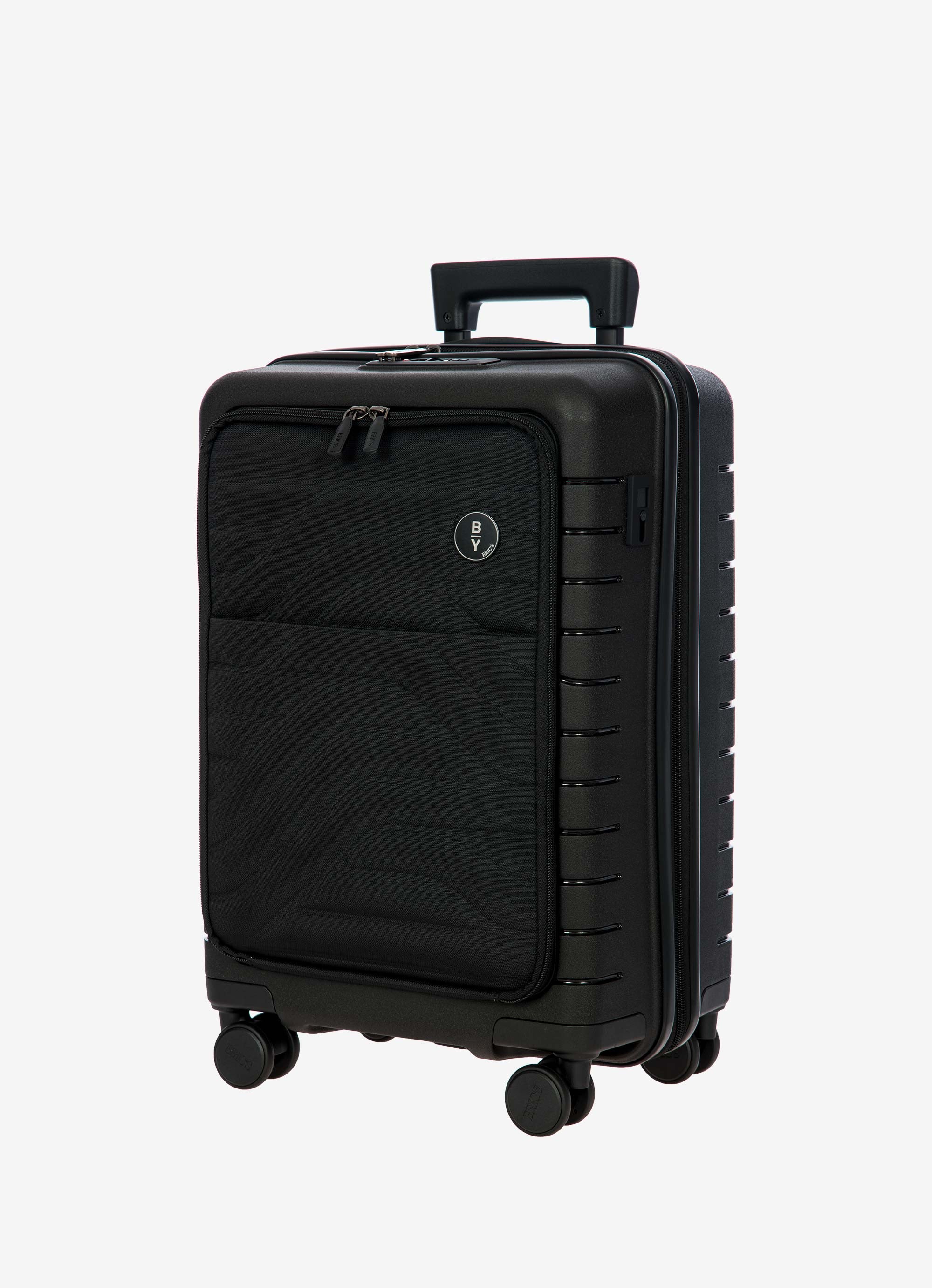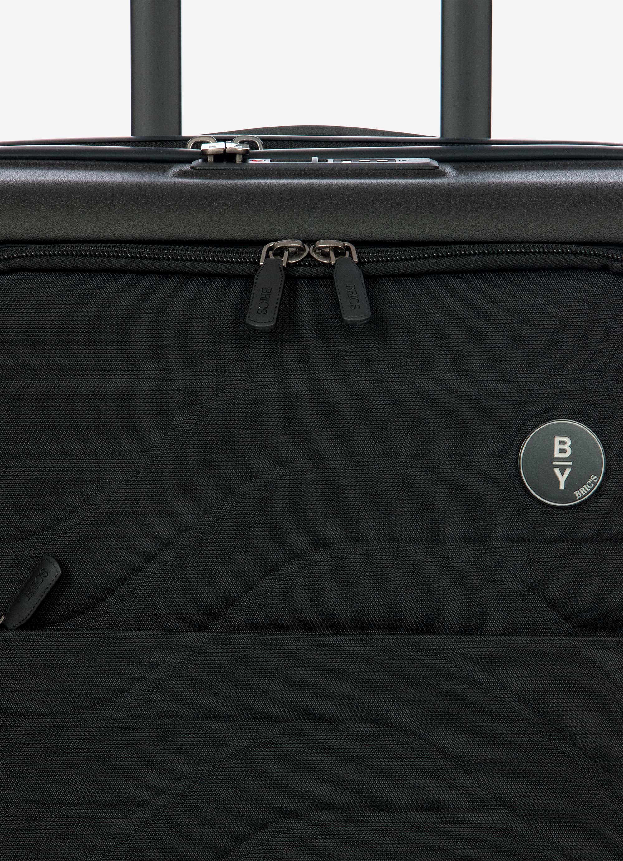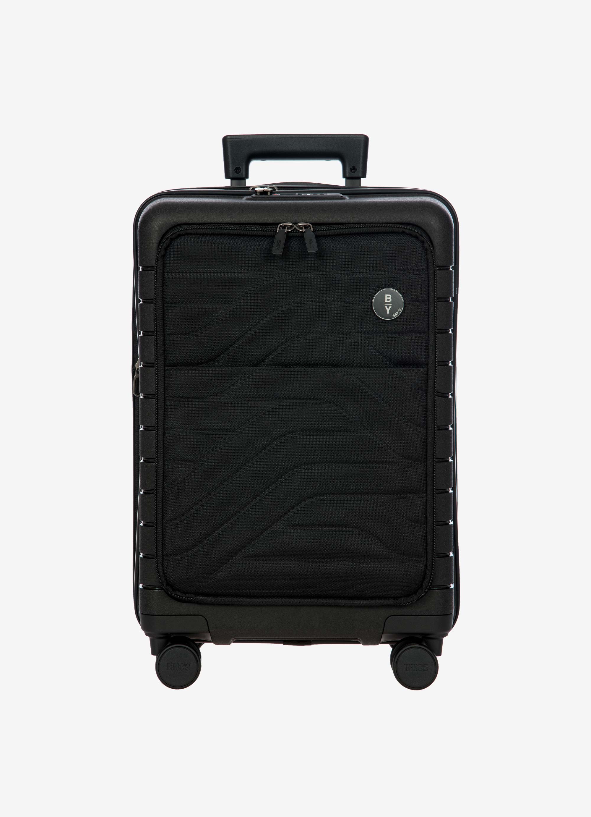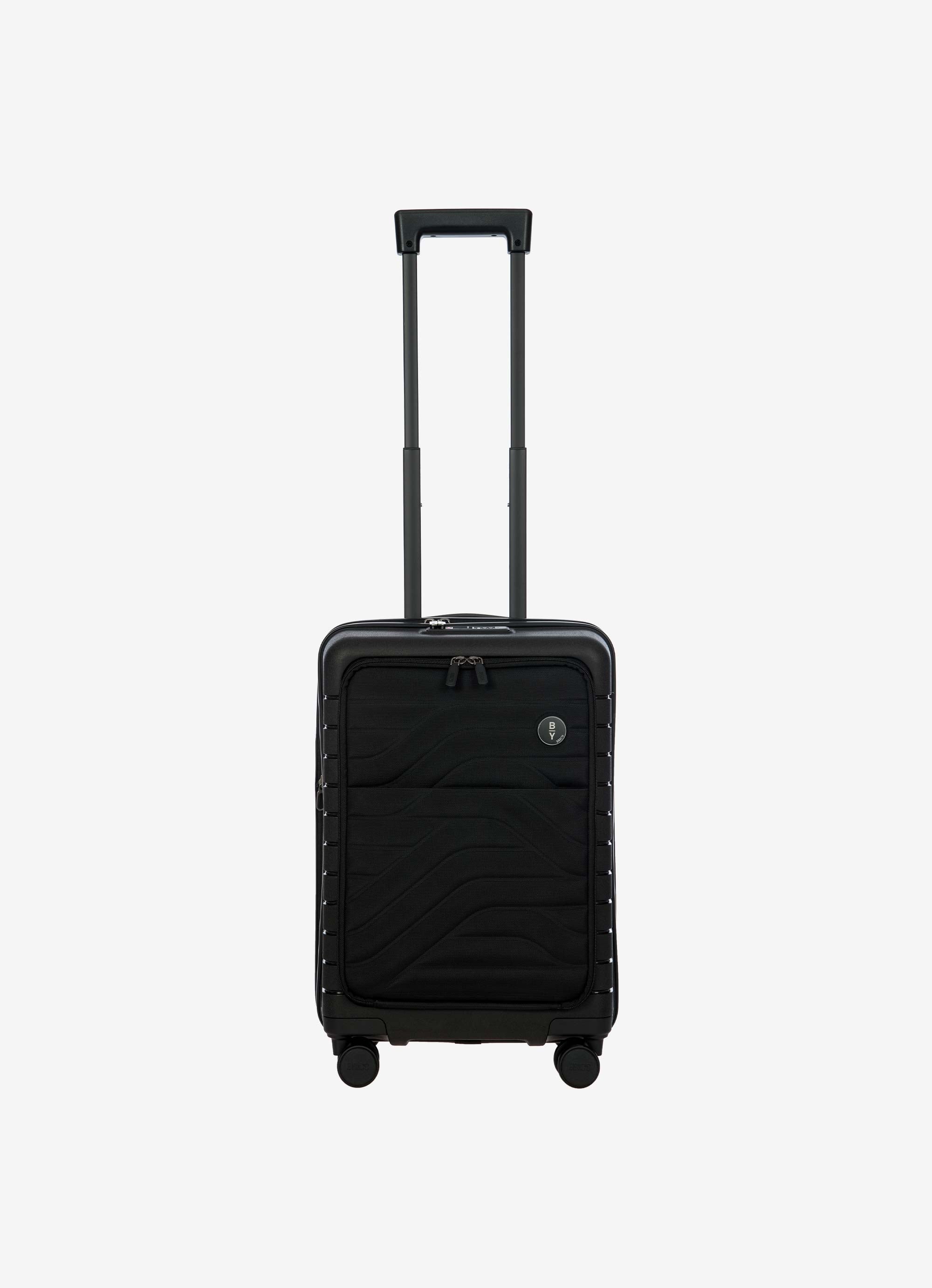 This expandable carry-on trolley with a pocket is part of the Ulisse B|Y collection by Bric’s. Practical but with a modern look, this suitcase with a pocket is ideal when travelling for work and even when on holiday. It ensures durability and sophisticated design thanks to the combination of a robust polypropylene shell and the soft yet hard-wearing fabric of the front pocket, which conceals a laptop/tablet sleeve complete with a protective band. OUTER SHELL: in polypropylene to ensure maximum lightness, flexibility and durability, with a front zip pocket to hold all items that are essential to have at hand. Zip fastening with a combination TSA lock integrated into the shell. When needed, a zip expansion system adds 4 cm to the depth to the suitcase. HANDLE: comfortable and practical, the aluminium retractable handle has three intermediate stop positions that can be engaged with a press button. The carry handle at the top is flat and ergonomic.INNER COMPARTMENT: one side has a zip and flat mesh pocket; the other has cross-straps to keep clothing in place. Soft polyester lining. A special pocket containing a removable and washable bag is designed to hold shoes or laundry.WHEELS: four double wheels, set into the body to optimise the capacity of the suitcase, which smoothly rotate 360°. Movement is silent thanks to their rubber coating. DETAILS: a textural urban-inspired design characterises the outside, and is repeated on the lining. Logo details on the zip pull, carry handle and the wheels, on-tone with the colour of the shell. Integrated address tag carrier. B|Y. Be Young. Be Bric's.