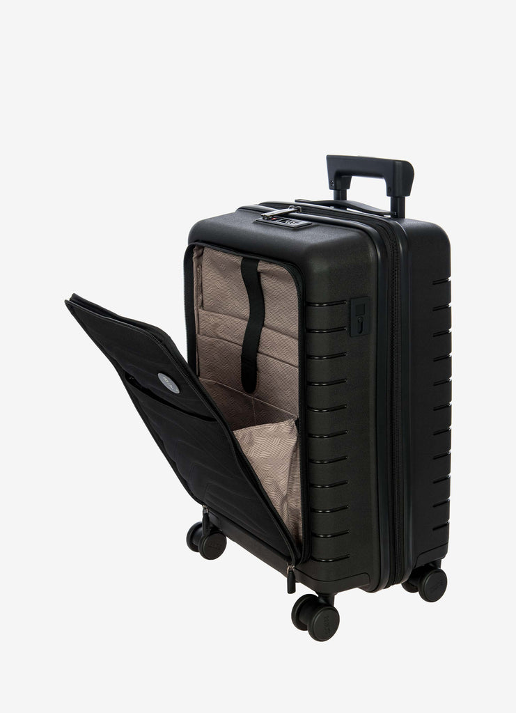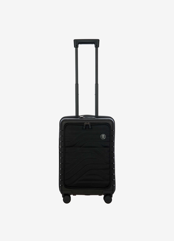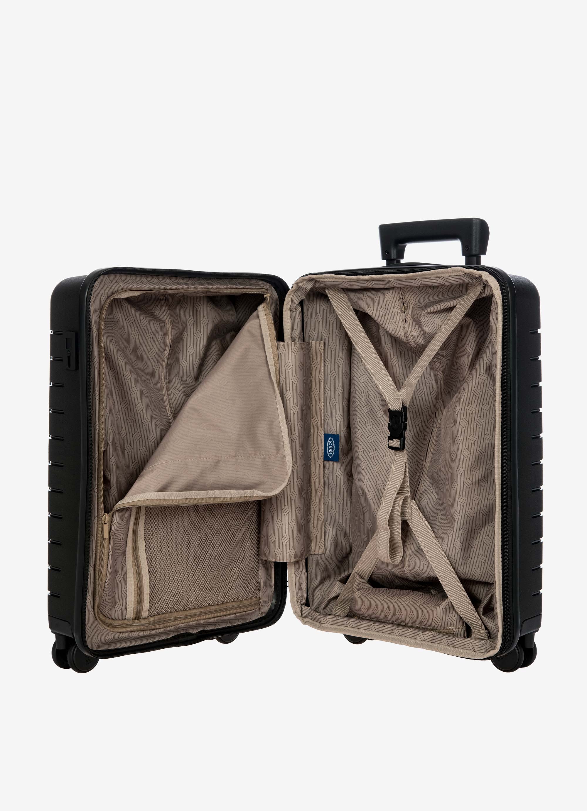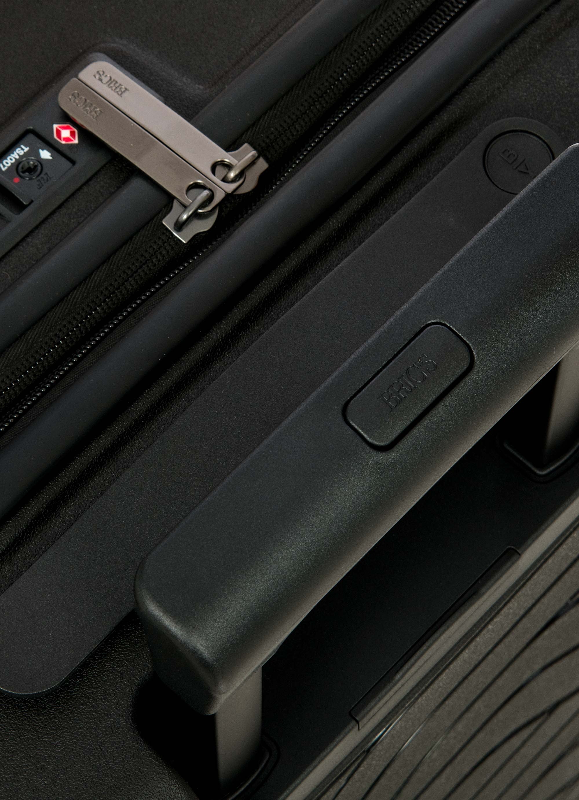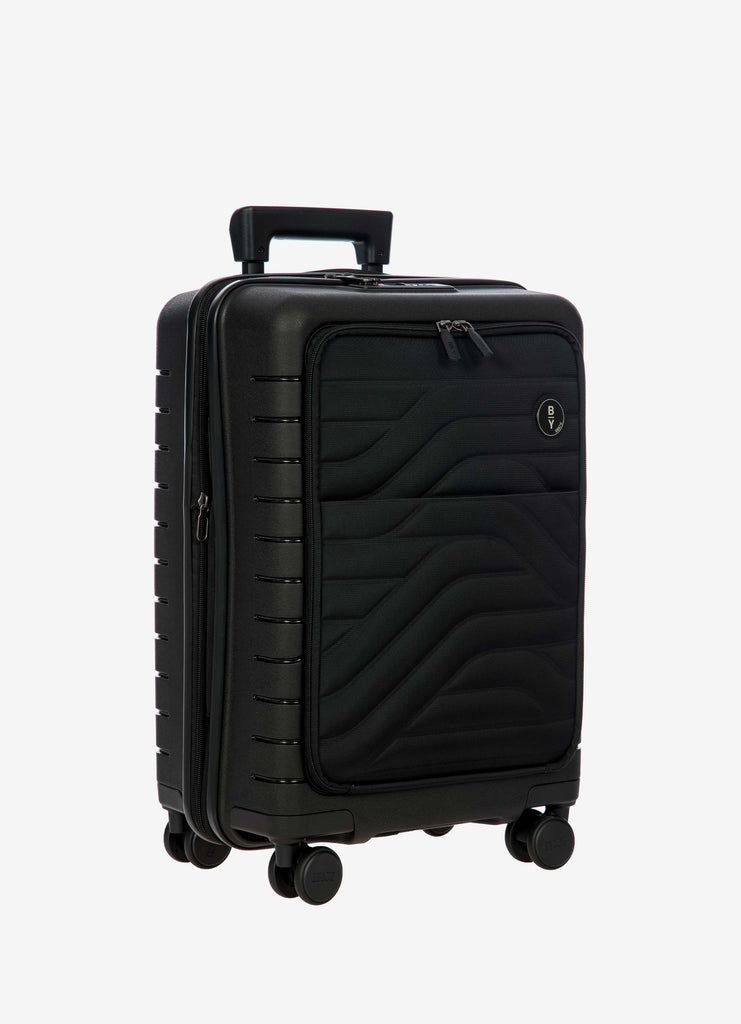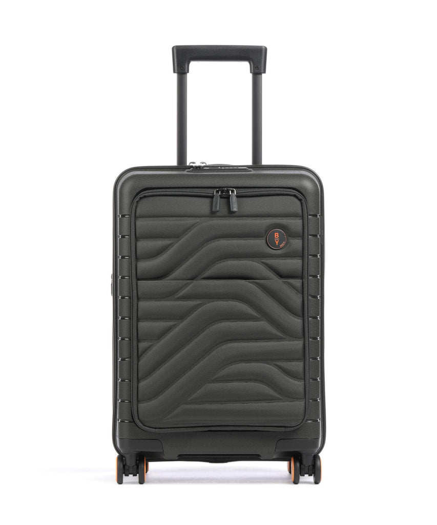 This expandable carry-on trolley with a pocket is part of the Ulisse B|Y collection by Bric’s. Practical but with a modern look, this suitcase with a pocket is ideal when travelling for work and even when on holiday. It ensures durability and sophisticated design thanks to the combination of a robust polypropylene shell and the soft yet hard-wearing fabric of the front pocket, which conceals a laptop/tablet sleeve complete with a protective band. OUTER SHELL: in polypropylene to ensure maximum lightness, flexibility and durability, with a front zip pocket to hold all items that are essential to have at hand. Zip fastening with a combination TSA lock integrated into the shell. When needed, a zip expansion system adds 4 cm to the depth to the suitcase. HANDLE: comfortable and practical, the aluminium retractable handle has three intermediate stop positions that can be engaged with a press button. The carry handle at the top is flat and ergonomic.INNER COMPARTMENT: one side has a zip and flat mesh pocket; the other has cross-straps to keep clothing in place. Soft polyester lining. A special pocket containing a removable and washable bag is designed to hold shoes or laundry.WHEELS: four double wheels, set into the body to optimise the capacity of the suitcase, which smoothly rotate 360°. Movement is silent thanks to their rubber coating. DETAILS: a textural urban-inspired design characterises the outside, and is repeated on the lining. Logo details on the zip pull, carry handle and the wheels, on-tone with the colour of the shell. Integrated address tag carrier. B|Y. Be Young. Be Bric's.