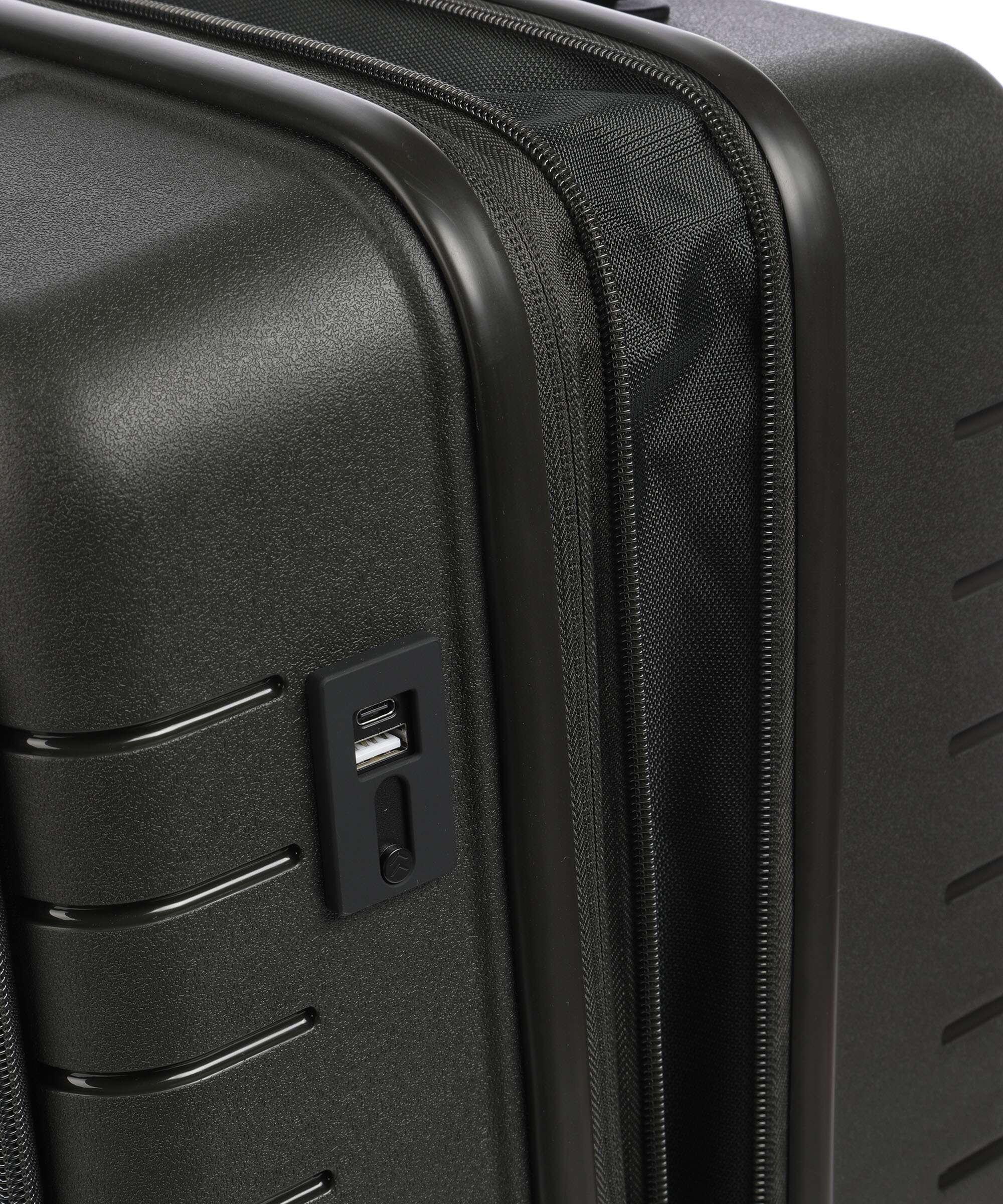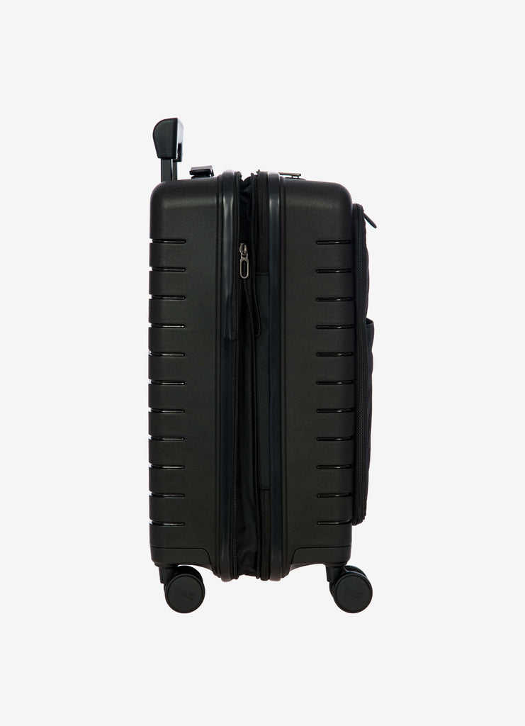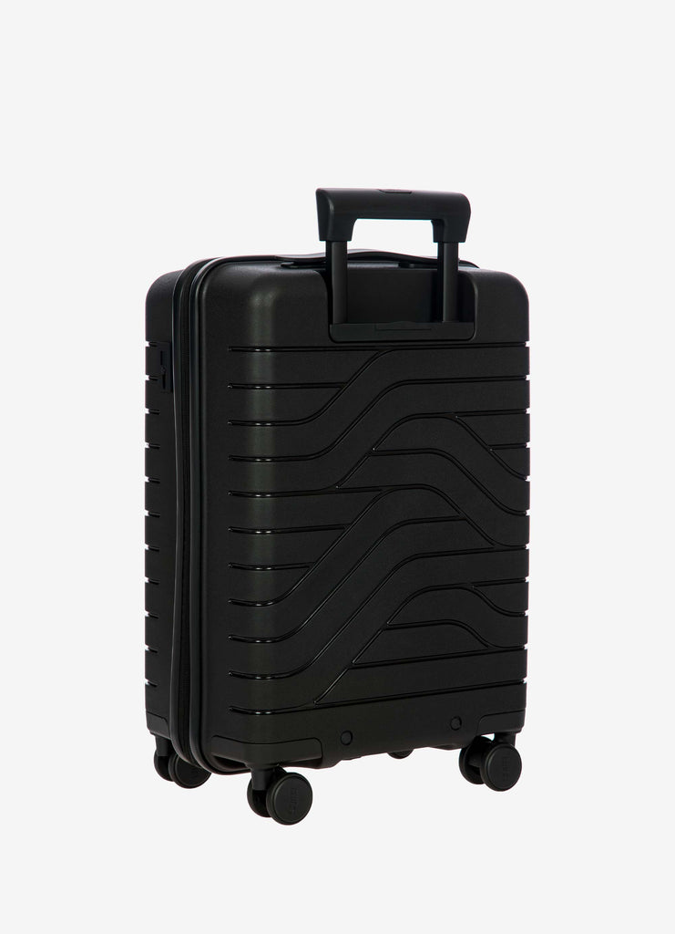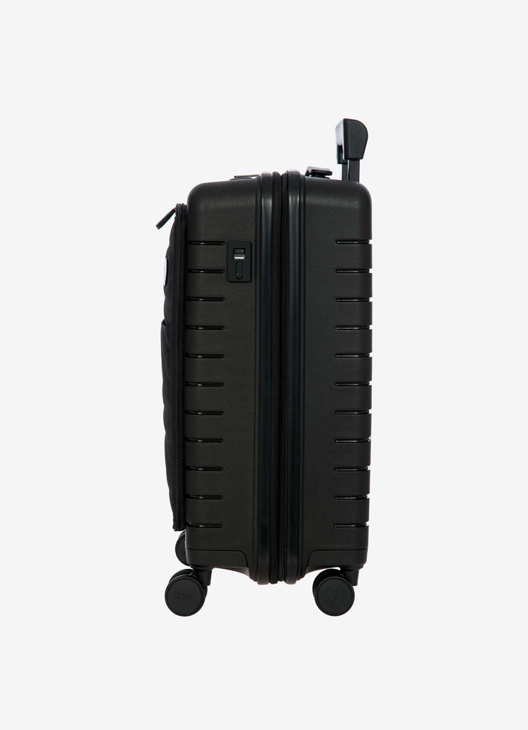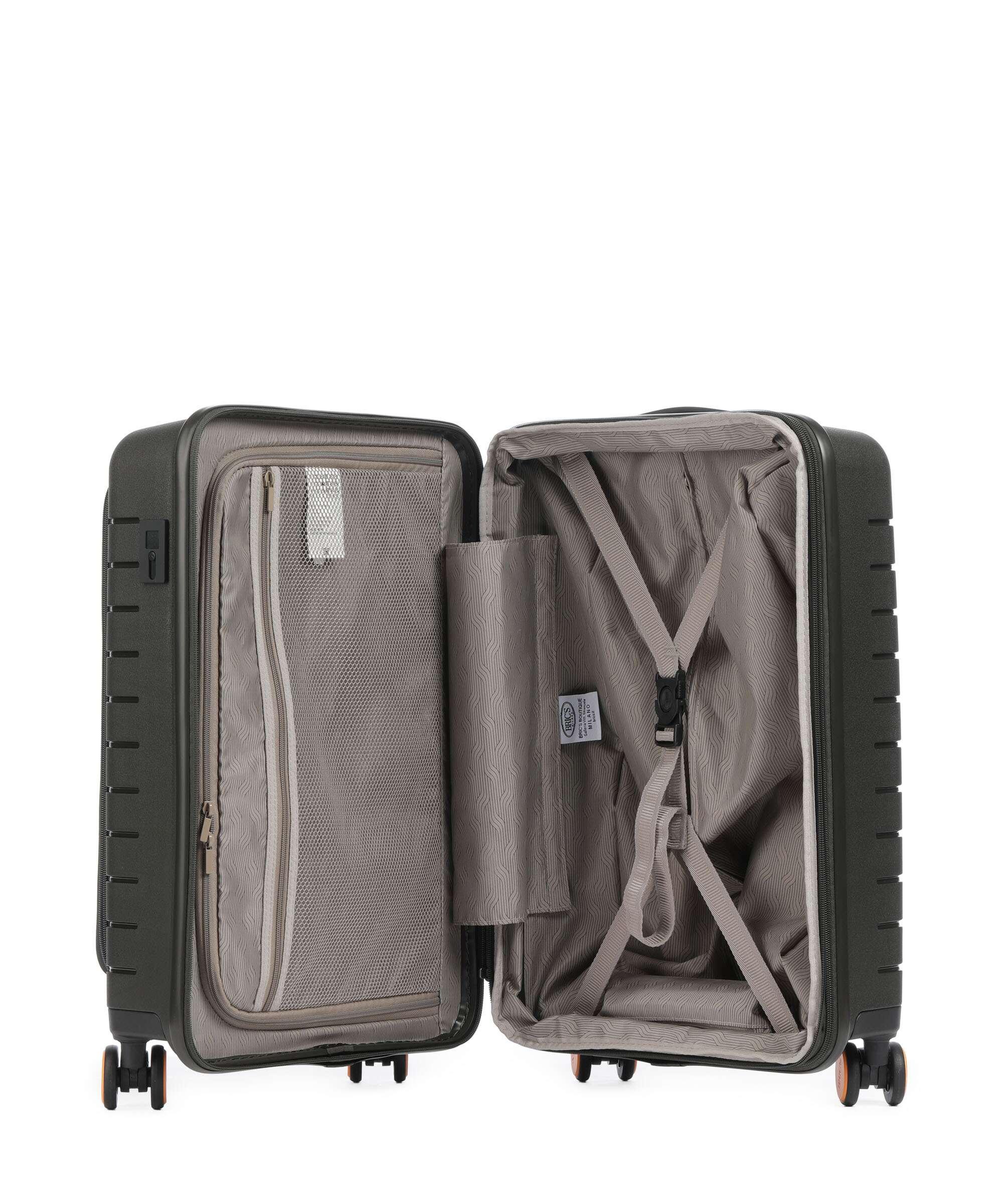 This expandable carry-on trolley with a pocket is part of the Ulisse B|Y collection by Bric’s. Practical but with a modern look, this suitcase with a pocket is ideal when travelling for work and even when on holiday. It ensures durability and sophisticated design thanks to the combination of a robust polypropylene shell and the soft yet hard-wearing fabric of the front pocket, which conceals a laptop/tablet sleeve complete with a protective band. OUTER SHELL: in polypropylene to ensure maximum lightness, flexibility and durability, with a front zip pocket to hold all items that are essential to have at hand. Zip fastening with a combination TSA lock integrated into the shell. When needed, a zip expansion system adds 4 cm to the depth to the suitcase. HANDLE: comfortable and practical, the aluminium retractable handle has three intermediate stop positions that can be engaged with a press button. The carry handle at the top is flat and ergonomic.INNER COMPARTMENT: one side has a zip and flat mesh pocket; the other has cross-straps to keep clothing in place. Soft polyester lining. A special pocket containing a removable and washable bag is designed to hold shoes or laundry.WHEELS: four double wheels, set into the body to optimise the capacity of the suitcase, which smoothly rotate 360°. Movement is silent thanks to their rubber coating. DETAILS: a textural urban-inspired design characterises the outside, and is repeated on the lining. Logo details on the zip pull, carry handle and the wheels, on-tone with the colour of the shell. Integrated address tag carrier. B|Y. Be Young. Be Bric's.