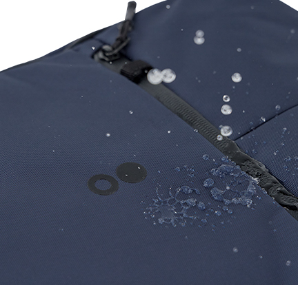 Water-resistant RPET fabric with waterproof zippers, combining sustainability and functionality.