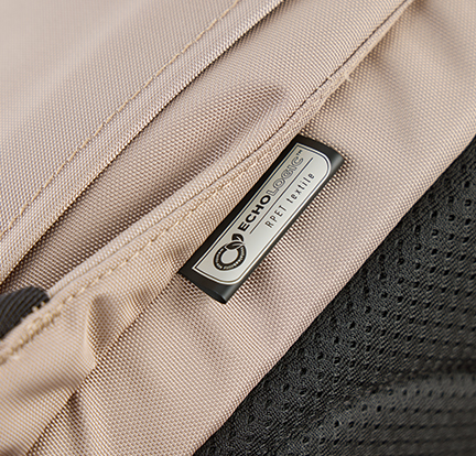 Water-resistant RPET fabric with waterproof zippers, combining sustainability and functionality.