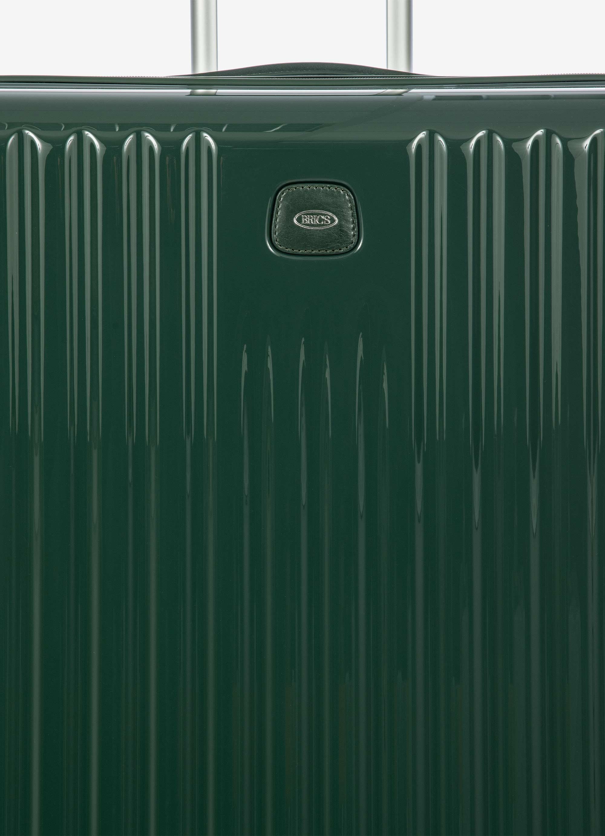 Positano Collection is made from durable recycled polycarbonate, flexible and resistant, with special shiny finishing. Lightweight and volume are the key features, as well as style: Positano Collection showcases striking color shades. To improve the exclusive look, all the elements feature a tone-on-tone finish in matching color: the handles, the zip, the
