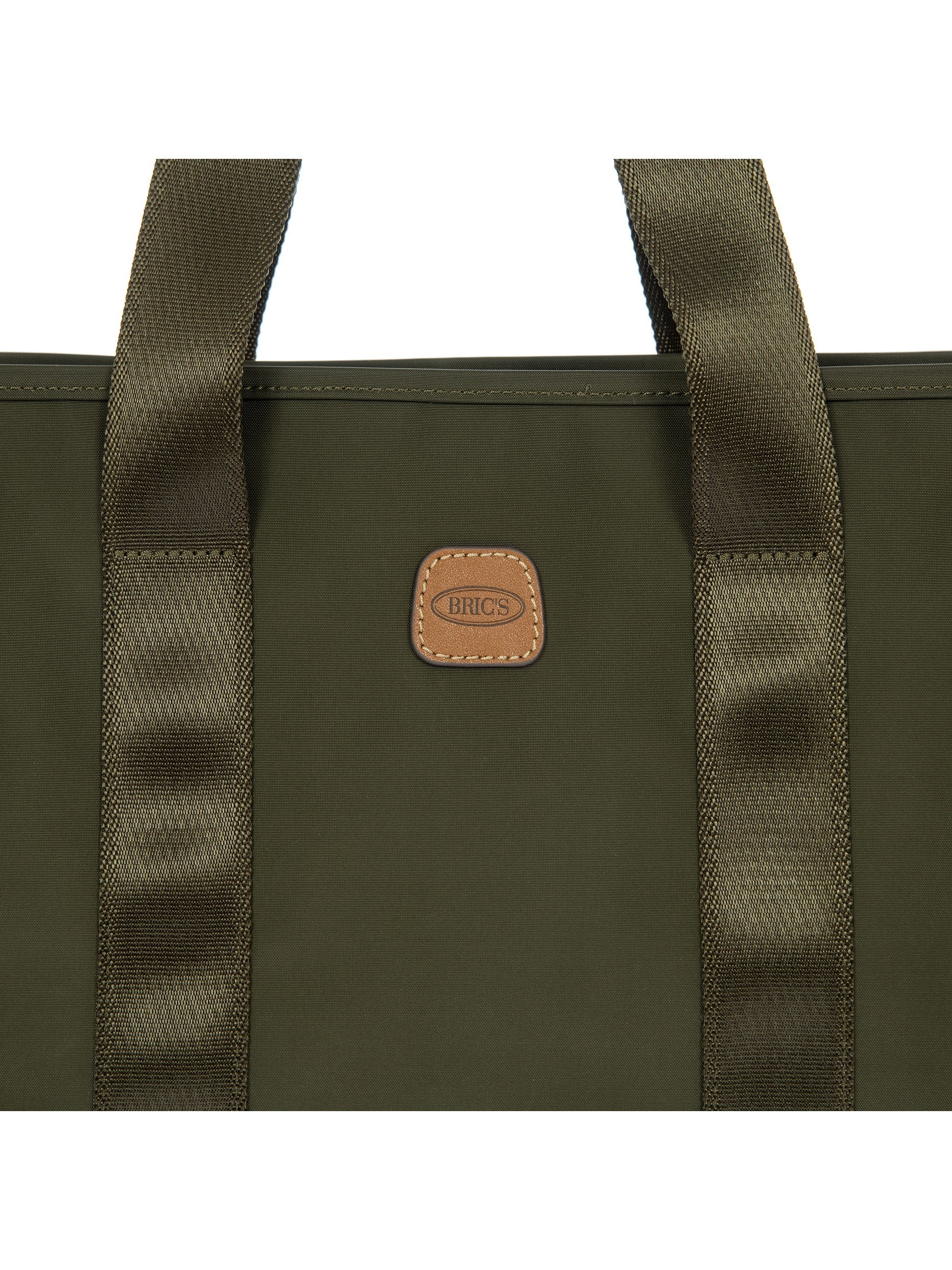 The X-Collection Opera Bag combines volume and essential lines, and is made of a water-proof, recycled fabric. Reinforced bottom, padded tablet pocket, double handle and removable shoulder strap for this functionally elegant bag. Safe zipped fastening. This functional 24/7 bag is embellished by ribbons and genuine leather details - Bric's hallmark.