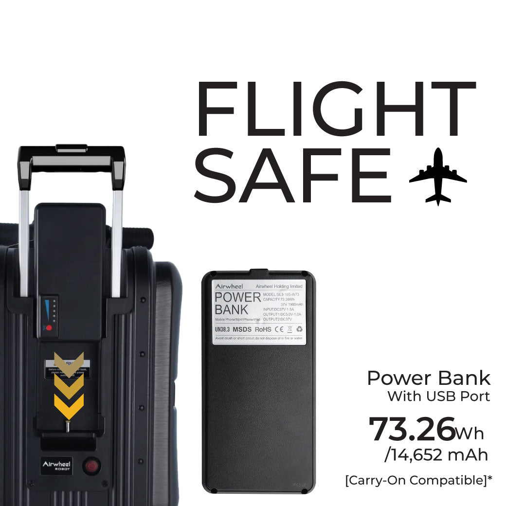 The Airwheel SE3S features a 73.26 Wh removable lithium battery, certified to UN38.3 standards and compliant with UN's 100 Wh power limits. Enjoy peace of mind with a high-quality, travel-friendly battery in your Airwheel luggage.*